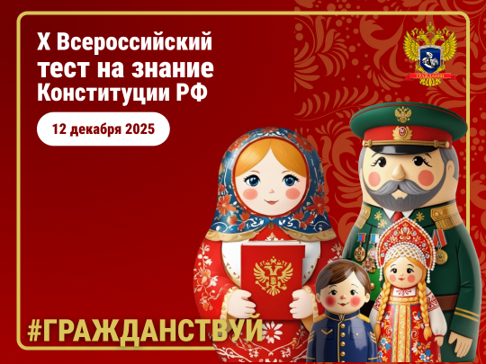 12 декабря состоится X Всероссийский тест на знание Конституции РФ. Всероссийское Общественное движение «Гражданин» проводит акцию ежегодно в честь празднования Дня Конституции Российской Федерации. Ее цель – оценить уровень правовой грамотности россиян, а также мотивировать общество к изучению гражданского строя страны и выполнению конституционных обязанностей.