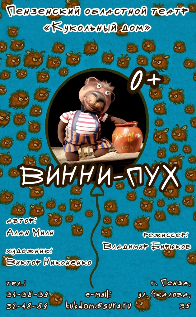 В основу спектакля легла детская повесть Алана Милна, известная многим с детства. Неуклюжий добродушный медведь постоянно попадает в переделки. И делает это не один – с ним всегда его друзья, маленький поросенок Пятачок, печальный ослик Иа и многие другие. Постановка Владимира Бирюкова прекрасно подходит взрослым, чтобы вспомнить детство и любимую историю, и детям, чтобы познакомиться с героями и сюжетом. За музыкальное оформление отвечает В.Тарасова, за сценографию и кукол – Виктор Никоненко. А на сцене вы увидите Марину Прошлакову, Валерия Карташова и Русланбека Джурабекова.